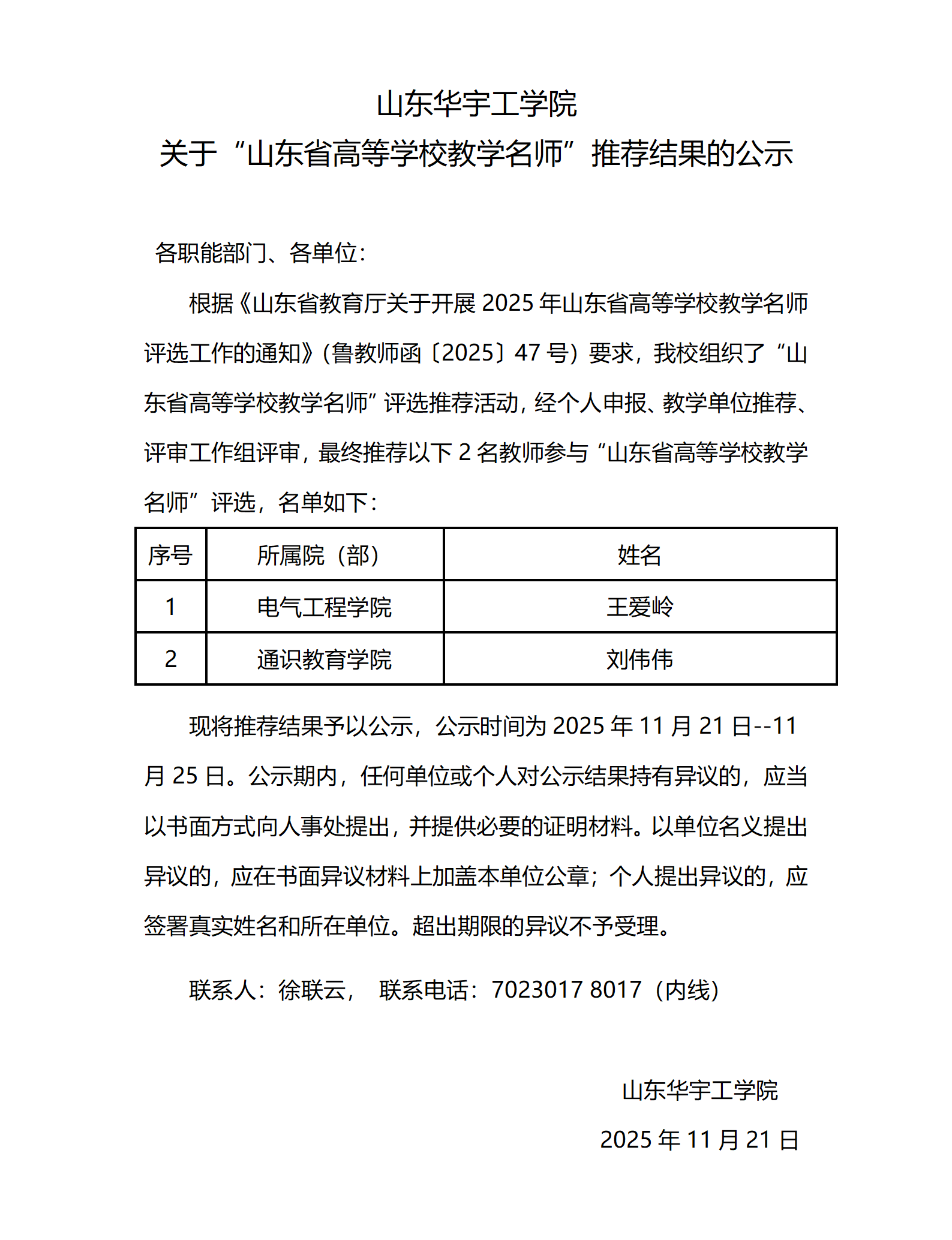 山东华宇工学院关于“山东省高等学校教学名师”推荐结果的公示